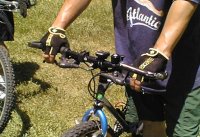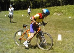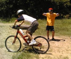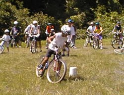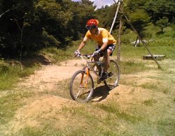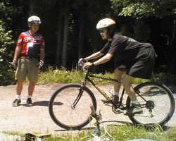 丸太越えと同じ要領で、頭の位置を一定にする。 MTBをへその下でコロコロとあそばせる感じ。 模範演技は会沢 |